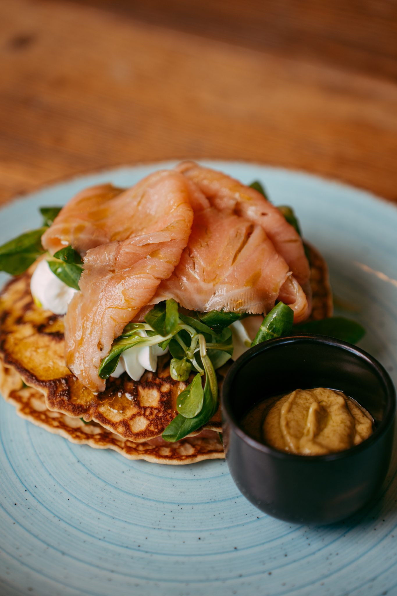 • Pancake con salmone affumicato, panna acida e valeriana: una versione salata elegante e sorprendente.